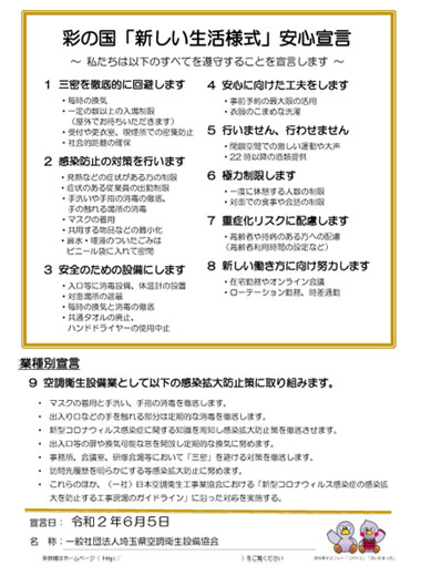 こうした中、協会では、空調衛生設備業界として「新しい生活様式」安心宣言を作成しましたところ、このほど埼玉県知事より彩の国「新しい生活様式」安心宣言団体として認定され、認定証の交付を受けました。